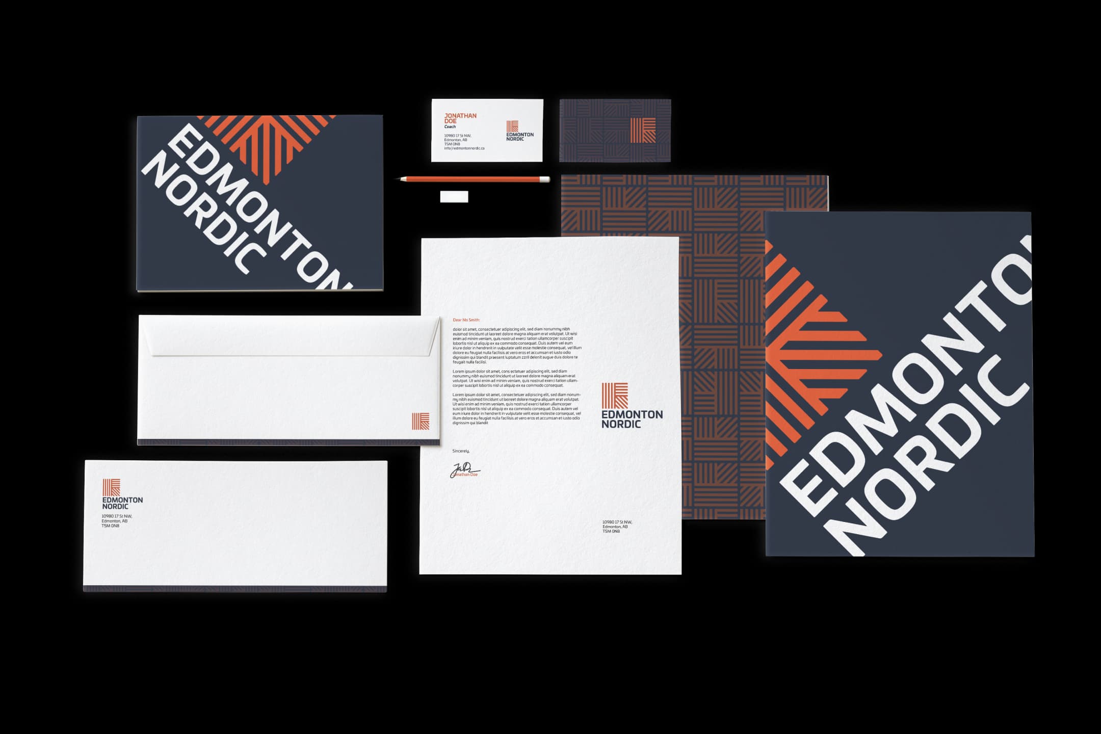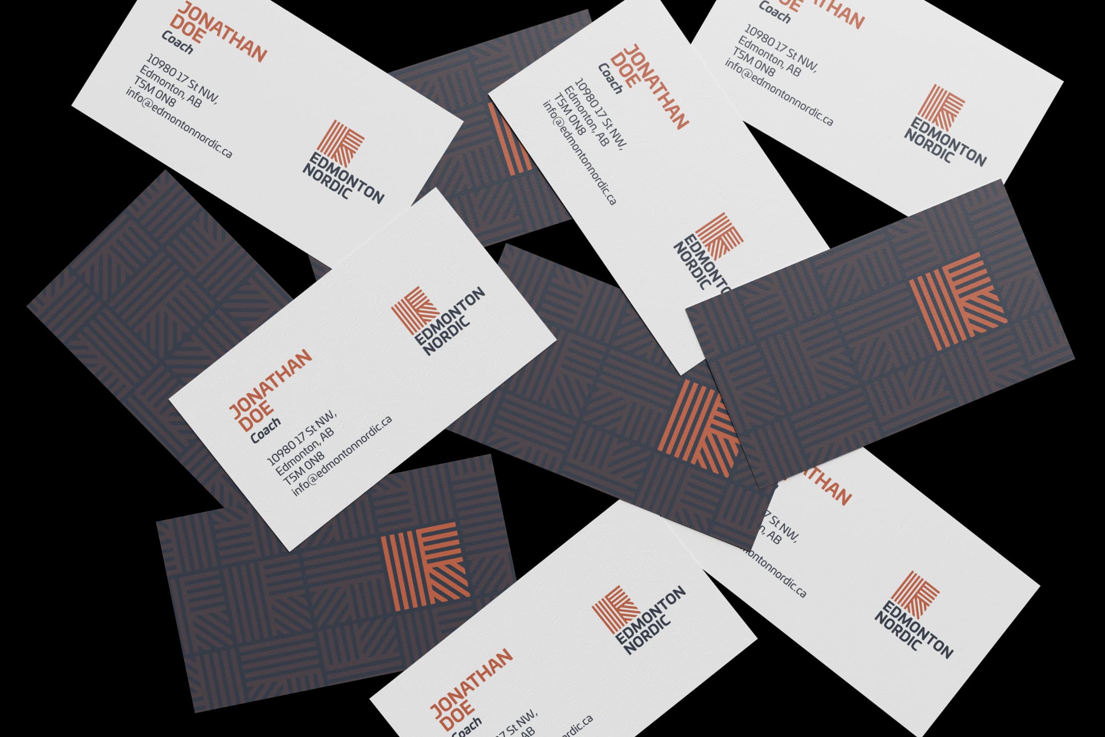The refreshed logo of the Edmonton Nordic Ski Club aims to represent winter sports, the Nordic, and the community that it builds. The logo comprises repeated lines inspired by the track skiers make on the snow. The arrangement of the lines mimics the corner of a snowflake, and the uniqueness of the mark is reminiscent of a Nordic sweater. The intersecting lines represent how Edmonton Nordic connects people through winter sports.