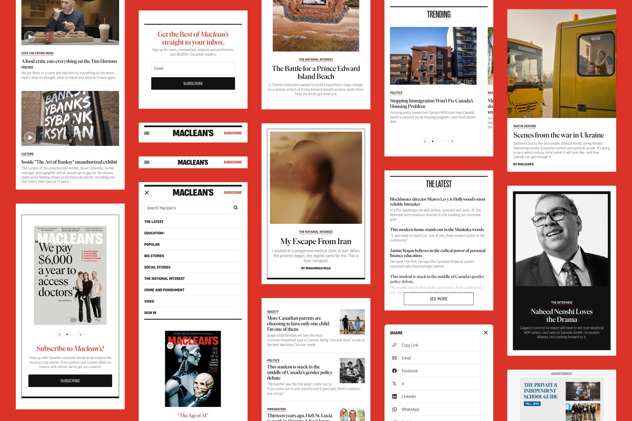 The previous site struggled with a lack of visual hierarchy, generic design, and poor usability. Readers found it hard to navigate stories, while multimedia content was limited and overshadowed by intrusive ads. The challenge was to modernize Maclean’s digital presence to engage a younger, cosmopolitan audience while preserving its 119-year history.